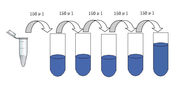 4) 标准品的稀释:取5支干净的Eppendorf管,每管加150μl的标准品稀释液,分别标记上标准品1,标准品2,标准品3,标准品4,标准品5.取150μl标准品原液加入标记标准品1 的管中,混匀后同样取出150μl,加入下一管,以此类推直至***一管。零孔:直接加标准品/样品稀释液。(见下图)
